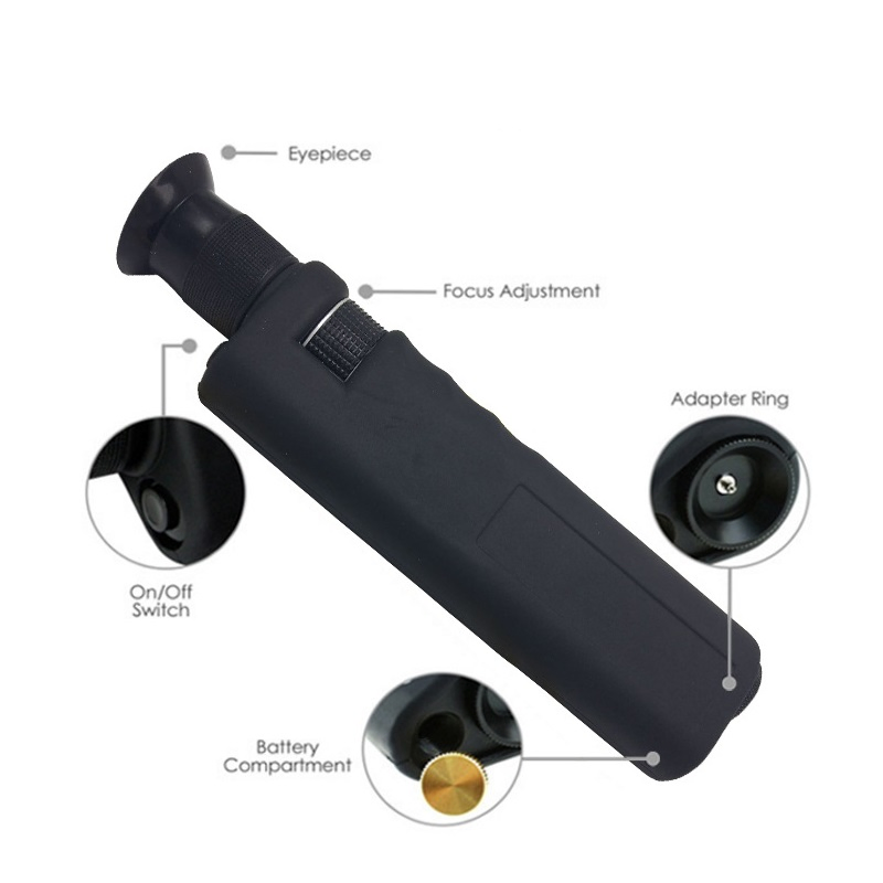Handheld 400X Optic Fiber Inspection Microscope with 1.25mm and 2.5mm Adapter Portable Fiber MicroscopeSpecification:The Handheld Fiber Microscope utilize a white LED for coaxial illumination. Light is introduced into the optical path(axis) so that it comes out the tip of the objective and strikes t......